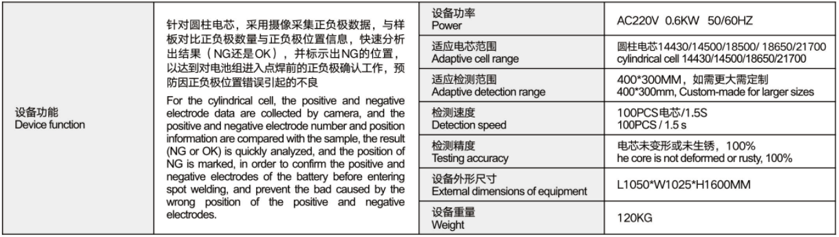 檢測速度:100PCS電芯/1.5S